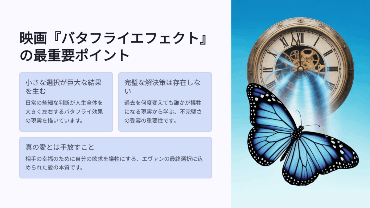バタフライ効果、運命の不可逆性、自己犠牲の愛という3つのテーマを深く理解することで、この作品の哲学的メッセージの本質に迫ることができます。これらは私たちの人生や経営においても重要な指針となるでしょう。