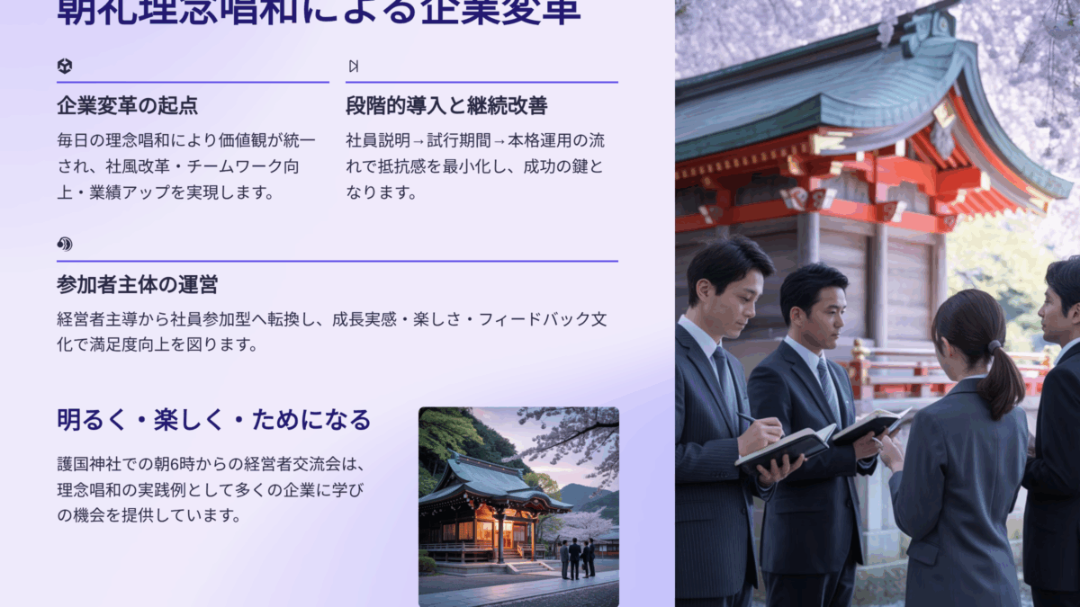 倫理法人会での学びを通じて確信したこと。それは、理念唱和を含む活力朝礼こそが、企業変革の起点だということです。形式的な朝礼から脱却し、人間性向上を軸とした活力朝礼を導入することで、あなたの会社も必ず変わります。
