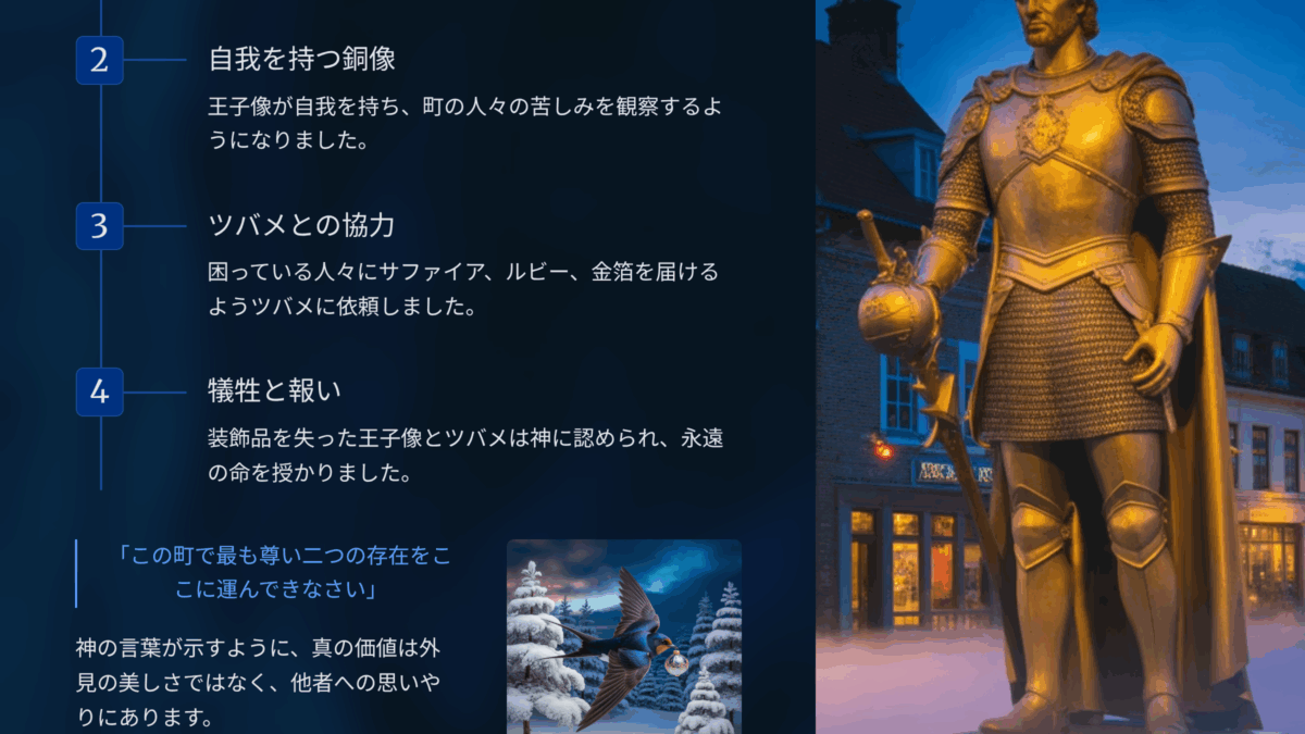 この物語の本質は「自らの持ち物を人の幸せに転換する力」にあります。王子は自分の輝きを失うことで、人々に生きる希望を与えました。職場に置き換えると、私たちも知識や経験、あるいは笑顔や励ましといった“目に見えない資産”を分かち合うことで、周囲の力になります。