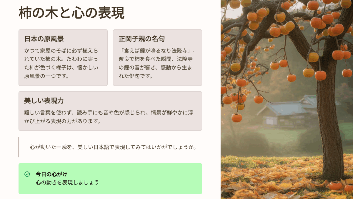 かつて日本では家のそばに柿の木が植えられ、その風景は人々の原風景となっていました。秋の季語としても愛され、俳句の題材として数多く詠まれています。正岡子規は奈良で柿を食べた瞬間に法隆寺の鐘が鳴り、その感動を簡潔な一句に込めました。難しい表現を避け、読み手に鮮やかな情景を伝えるその俳句は、心が動いた瞬間を言葉にする大切さを示しています。