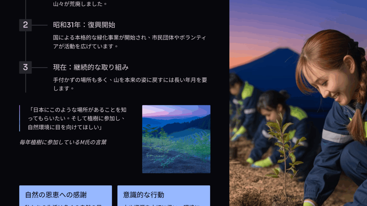栃木県の足尾銅山は、かつて国内一の銅産出量を誇りましたが、排煙や鉱毒水によって周辺環境は深刻に荒廃しました。昭和三十一年から国による緑化事業が始まり、市民やボランティアの植樹活動が続いています。しかし、山を本来の姿に戻すには長い年月が必要です。植樹参加者は、環境への意識を高め、資源を大切に扱うよう訴えています。私たちの生活は自然の恩恵に支えられており、感謝と畏敬の念を持つことが重要だと示されています。