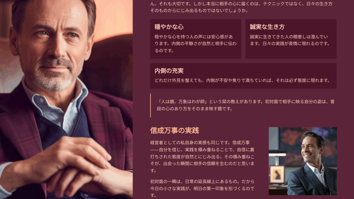 経営者としての私自身の実感も同じです。信成万事――自分を信じ、実践を積み重ねることで、自信に裏打ちされた態度が自然とにじみ出る。その積み重ねこそが、出会った瞬間に相手の信頼を生むのだと思います。