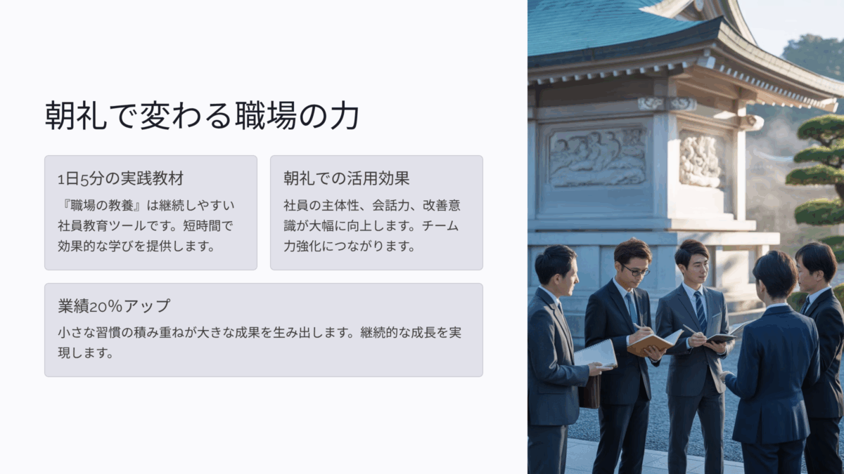 岡山市南倫理法人会の実践事例から『職場の教養』を使った社員教育の効果を解説。朝礼活用法、社員の変化、業績20%アップの要因まで。経営改善に役立つ具体的な導入ステップも紹介します。