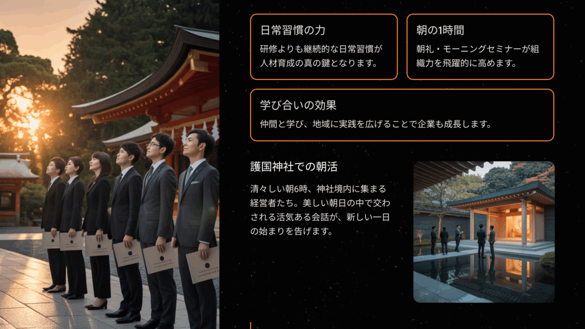 👉 経営者同士の学び合いを知りたい方へ → モーニングセミナーの雰囲気を知る