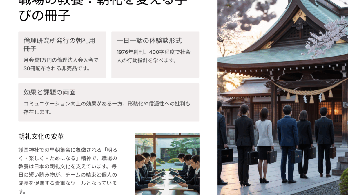 今では月間200万部が発行される朝礼用冊子として全国の企業で活用されていますが、その実態や効果について正しく理解されていない部分も多いのが現実です。この記事では、一般社団法人倫理研究所が発行する「職場の教養」の全容について、実際に活用してきた立場から詳しくお伝えします。