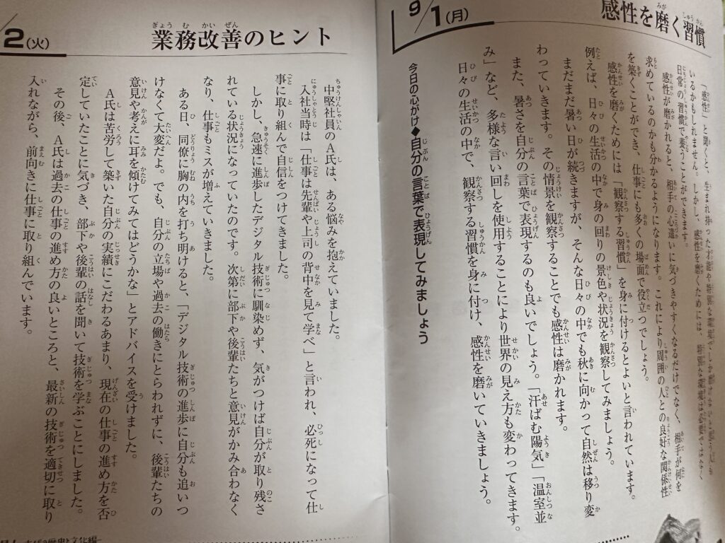 朝礼で職場の教養を活用する際、最も重要なのは「どんな内容が掲載されているのか」を理解することです。私も最初は「説教臭い内容では?」と心配でしたが、実際に読み始めてみると想像以上に実践的で、社員の皆さんも自然に受け入れてくれました。ここでは具体的にどのような話題が取り上げられ、どんな構成になっているのかを詳しくご紹介します。